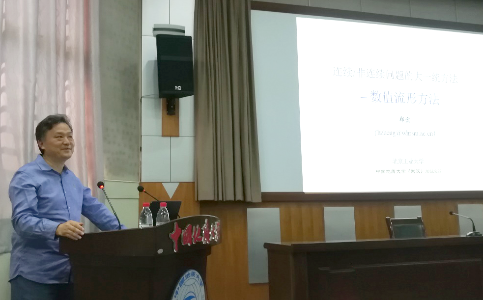 郑宏教授以《连续/不连续问题的大统一方法---数值流形法》为题,详细讲解了数值流形法的基本原理和典型应用。并且通过计算力学史上的几个典型难题,展现了NMM的巨大优势。在讲解的过程中,郑宏教授以FEM着手,深入浅出地讲解了如何实现从FEMNMM方法的跨越。报告结束之后,郑宏教授不仅详细回答了师生提出的问题,还赠送了NMM的相关理论资料和有详细帮助文档的NMM程序。