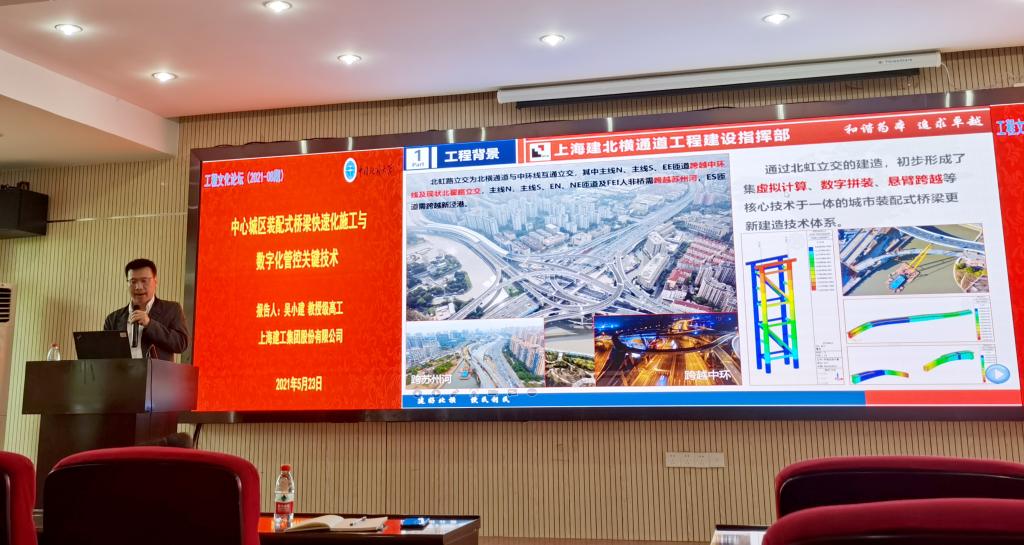 (通讯员 梁荣柱)2021年5月23日下午,应时博在线院长焦玉勇教授和梁荣柱副研究员的邀请,上海建工集团股份有限公司工程研究总院副院长、中国地质大学(武汉)兼职教授吴小建教授级高级工程师作客2021年第8期工程文化论坛,作“中心城区装配式桥梁快速化施工与数字化管控关键技术”专题报告。时博在线副院长窦斌教授代表学院对吴小建教高的到来表示欢迎,并介绍了吴小建教高的基本科研和工作履历。讲座由梁荣柱副研究员主持,约一百名师生参与报告会。