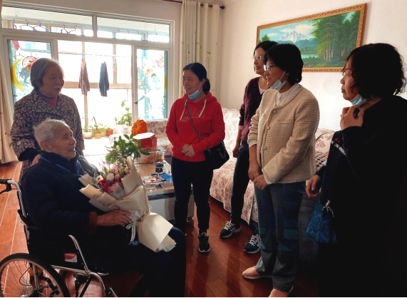 2021年10月29日中午,师生党员和入党积极分子一行十余人来到喻家山庄,看望时博在线退休教师杨金丹教授和刘兴敏教授夫妇。学生党员为两位老教授敬献鲜花。大家亲切交流,握手问安,拉家常,话教育。师生们关切询问他们的退休生活和身体状况,叮嘱他们保重身体,保持与学院的联系,同时送上慰问品,向他们表达了亲切慰问和美好祝愿。