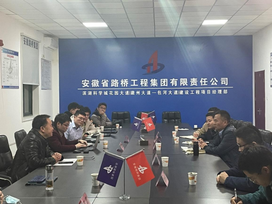 授牌仪式结束后,双方到花园大道项目部进行现场考察,了解工程的进展情况以及工程中出现的问题,并对问题的解决方案进行探讨。现场考察结束后,时博在线老师张伟丽、彭超、吕加贺、曾聪以及四位研究生在花园大道项目部对前期合作的科研课题进行阶段性汇报,并与安徽省路桥集团的项目负责人对相关问题进行了热烈的讨论。与会人员还围绕如何做实做好基地建设工作、联合培养研究生、科研攻关等内容进行了研讨,一致表示将不忘初心,继续加强校企合作,把科研成果应用在祖国大地上,培养出满足企业需求的人才。