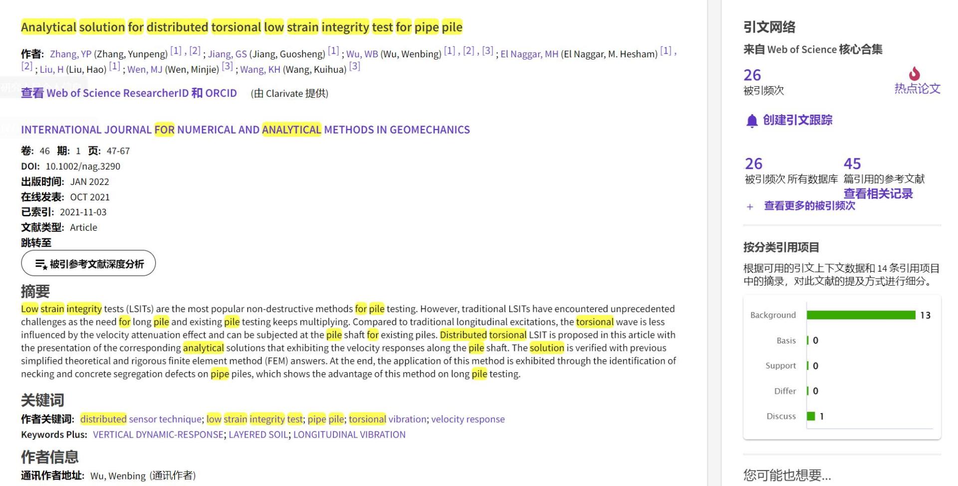 (通讯员 黄静)根据2022年9月基本科学指标数据库(Essential Science Indicators,简称ESI)最新数据显示,时博在线勘察与基础工程系吴文兵教授团队于2021年在国际岩土工程数值计算权威期刊International Journal for Numerical and Analytical Methods in Geomechanics上发表的学术论文“Analytical solution for distributed torsional low strain integrity test for pipe pile”入选ESI热点论文(Hot Paper)。该论文第一作者为2020级博士研究生张云鹏,通讯作者为吴文兵教授,中国地质大学(武汉)时博在线为第一署名单位。