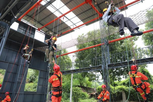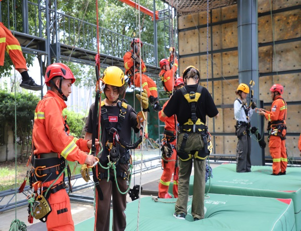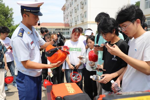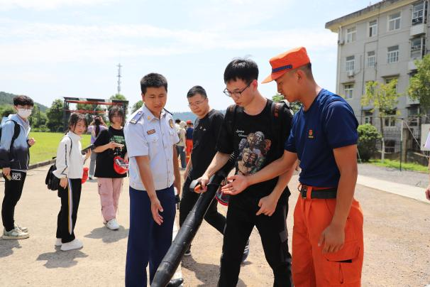 重温入党誓词后,055211和055212班全体学生在四大队消防官兵的指导下,开展了消防应急实习实训,四大队指战员带领师生参观了大队房宿、荣誉室,现场展示了部分先进消防装备的使用方法,指导学生开展了训练演习、消防设备实操训练、绳锁救援训练等活动。安全工程系教师与四大队指战员开展了消防技术和装备的交流和探讨。