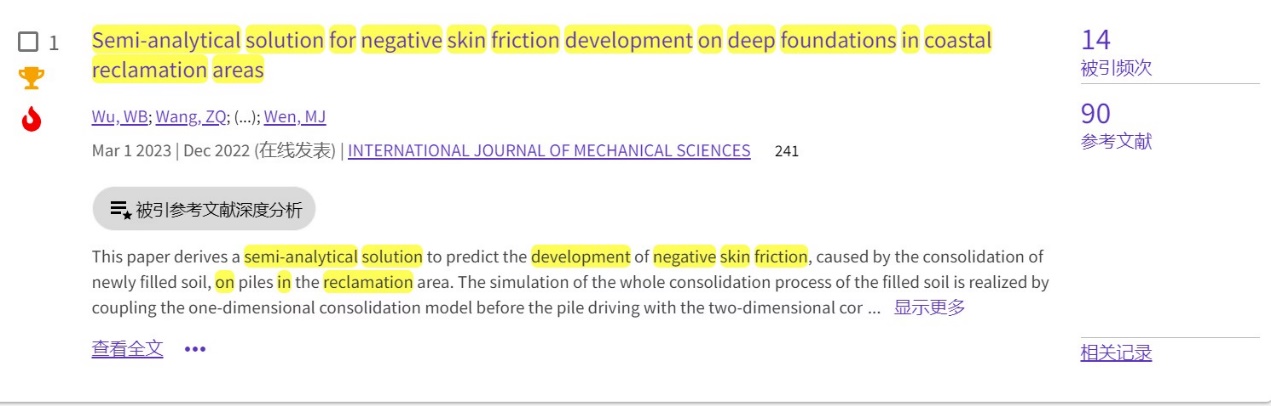 (通讯员 黄静)根据2023年7月基本科学指标数据库(Essential Science Indicators,简称ESI)最新数据显示,时博在线勘察与基础工程系吴文兵教授团队于2023年在国际工程力学领域权威期刊International Journal of Mechanical Sciences(IF: 7.3, 中科院一区TOP)上发表的学术论文“Semi-analytical solution for negative skin friction development on deep foundations in coastal reclamation areas”同时入选ESI热点论文和高被引论文。该论文第一作者为吴文兵教授,第二作者为勘察与基础工程系王宗琴硕士,中国地质大学(武汉)时博在线为第一署名单位。