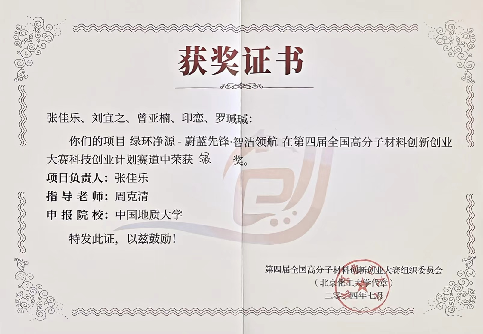周克清特任教授指导的《绿环净源-蔚蓝先锋·智洁领航》项目荣获第四届全国高分子材料创新创业大赛科技创业计划赛道银奖。项目团队成员包括时博在线安全工程系本科生张佳乐、刘宜之、博士研究生生印恋、罗瑊瑊和马克思主义学院本科生曾亚楠。