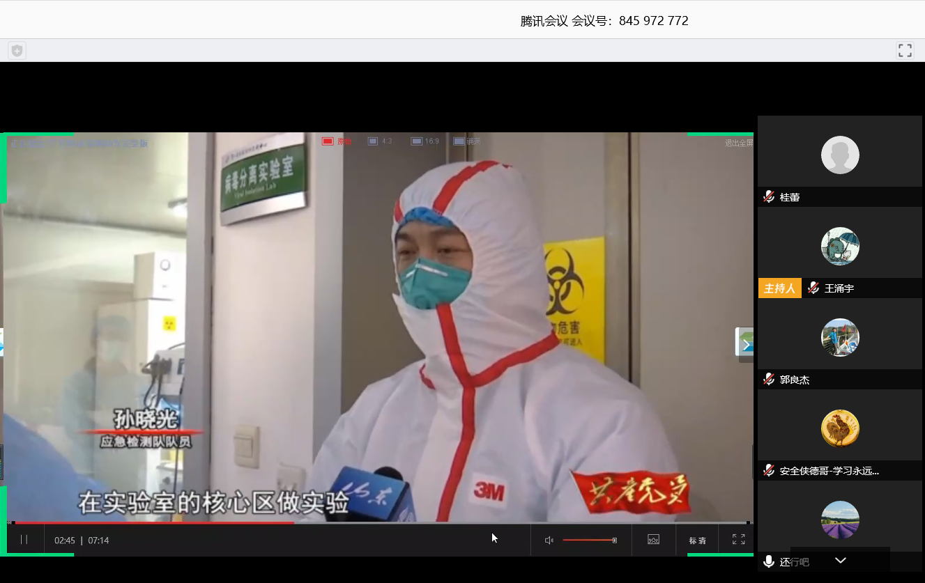 2020年3月26日下午3点至5点,安全工程系党支部在腾讯会议平台开展了主题党日活动。本次活动由党支部书记周克清同志主持,他首先带领党员完成规定动作后,进行本期主题党日活动的主要内容:1)学习习近平总书记在湖北省考察新冠肺炎疫情防控工作讲话精神;2)学习习近平总书记在决战决胜脱贫攻坚座谈会上的讲话精神; 3)学习疫情防控工作先进事迹;4)分享近期工作。