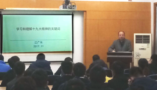 在全院学习十九大精神的浓厚氛围下,11月21日,党员骨干培训班正式开班。第一堂课,为帮助同学们深入学习十九大精神,江广长为学员们解读了十九大关键词。它们分别是:历史性变革、新时代、社会主要矛盾转化、历史使命、习近平新时代中国特色社会主义思想、基本方略。江广长结合历史及现阶段我国的基本情况,带领学员们学习、领会十九大精神的核心,并以“学习十九大精神,我们永远在路上”拉开此次骨干培训班的序幕。