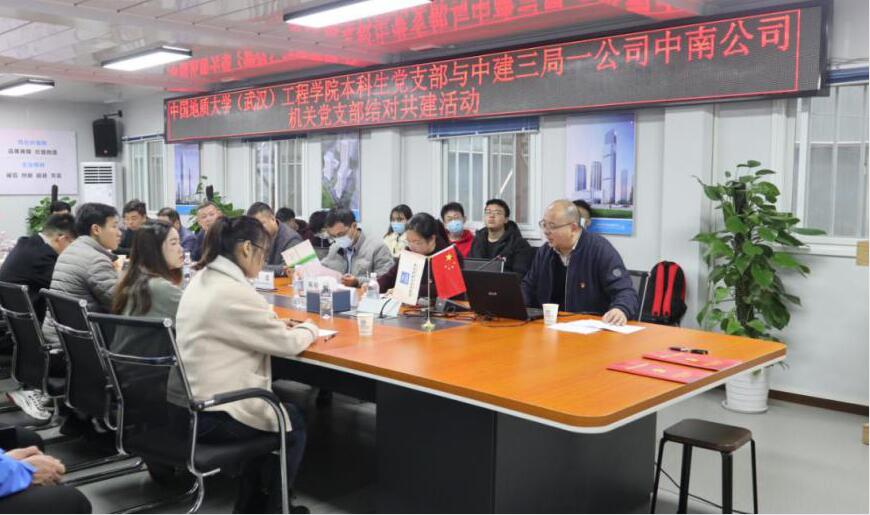 (通讯员:陈启维 李振华)为进一步探索校企合作人才培养模式,引导学生前置行业认知,中建三局一公司中南公司机关党支部与中国地质大学(武汉)时博在线道桥与建筑专业本科生党支部于2020年11月22日在光谷中心项目总部开展了“党建引领·校企共建”结对共建活动。中建三局一公司人力资源部副经理李骄健,中建三局一公司中南公司副总经理、超高层管理中心负责人梁劲松,副总经理王雅林,机关党支部书记陈婷华,中国地质大学(武汉)时博在线党委副书记江广长,学生办公室主任文新,辅导员王俊、李振华以及双方的党员代表参加本次活动。