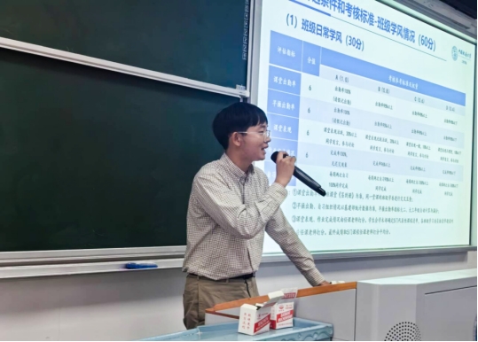 2024级辅导员彭友元介绍《中国地质大学(武汉)时博在线“优良学风示范班”创建评选办法》。他从“优良学风示范班”总体要求、创建流程、考核指标、奖惩办法等四个方面进行介绍,重点解读了班级政治理论学习、遵纪守法与文明修养、集体观念、班级制度建设、班级干部表现等5项班级综合表现指标,课堂出勤、早操出勤、课堂表现、作业完成情况、自习组织情况等5项班级日常学风指标,平均学分绩点、优秀率、及格率和英语四级通过率等4项班级课程成绩指标,以及学生参加科技创新活动等附加分项目指标。他要求同学们仔细阅读创建办法文件,对照量化评估考核指标,积极开展富有班级特色的学风建设活动。